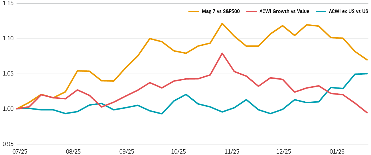 Sources : BNPP AM, Bloomberg – Nouvelle base 100 de tous les indices relatifs au 4 juillet 2025 et en dollars, rendement net total, indices relatifs calculés comme des ratios des valeurs respectives - MSCI ACWI World ex US, MSCI USA Index, MSCI ACWI World Growth, MSCI ACWI World Value.